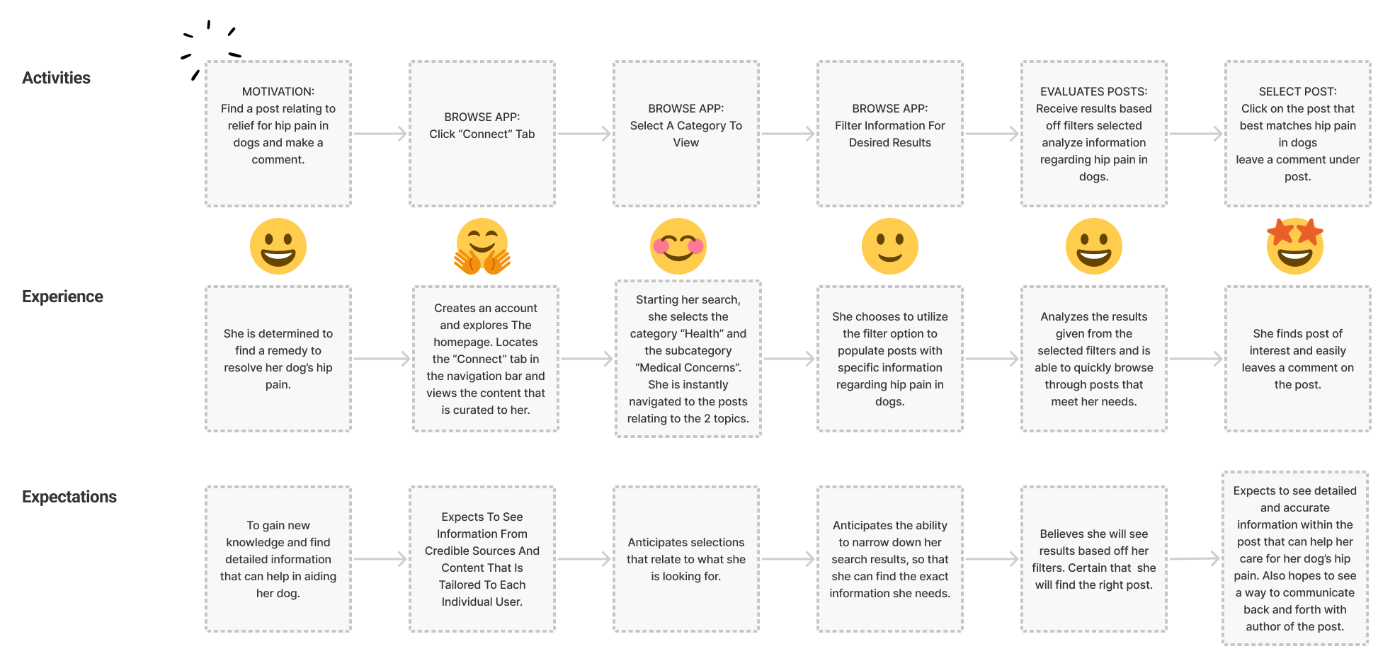 We then developed a proposed user journey map for the mobile experience that we hoped to create with a similar task. The proposed task would be to find a relevant post relating to hip pain in dogs and write a comment responding to the post. The journey map below showcases emotions and tasks that we expected the user to go through in our new feature.