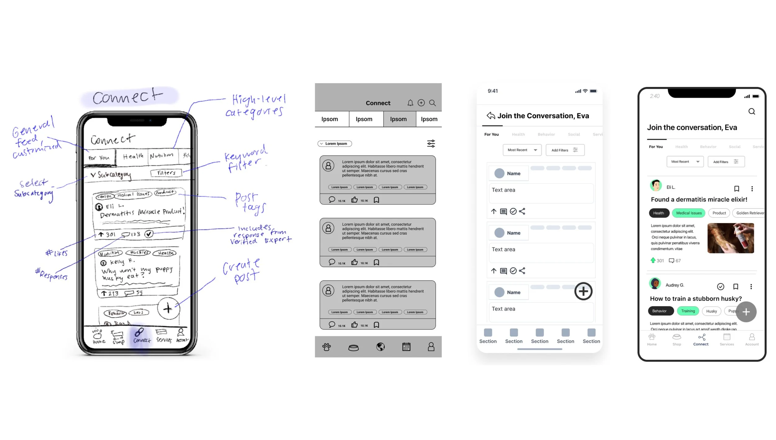 The evolution of the main content feed screen is shown here within the “Connect” feature. Starting on the left, from an initial sketch, to the right where it evolved into a high fidelity wireframe.
